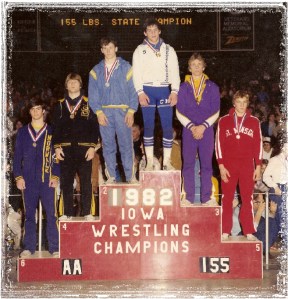 My hubby is the one standing on the #2 step, this was his senior year, we were engaged, and this was his first lost for the whole year. His senior record was 33-1. He wasn’t in a very good mood, but he did have an excuse. He hyper – extended his elbow the match before the finals. I was there as a cheerleader, however, I was cheering for his rival school, only 5 miles away. At least he didn’t have to wrestle against anybody from my school in the state tournament, because he already beat him out before he got there. It sounds like I’m a little proud of my hubby of almost 25 years, well I am! Now he still uses this God gifted talent rolling around on a wrestling mat in our basement with the boys we work with or to restrain them when needed.