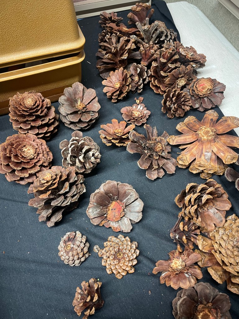 Going to take these pine cones God created and come up with some kind of creative craft to do with the ladies this month.’